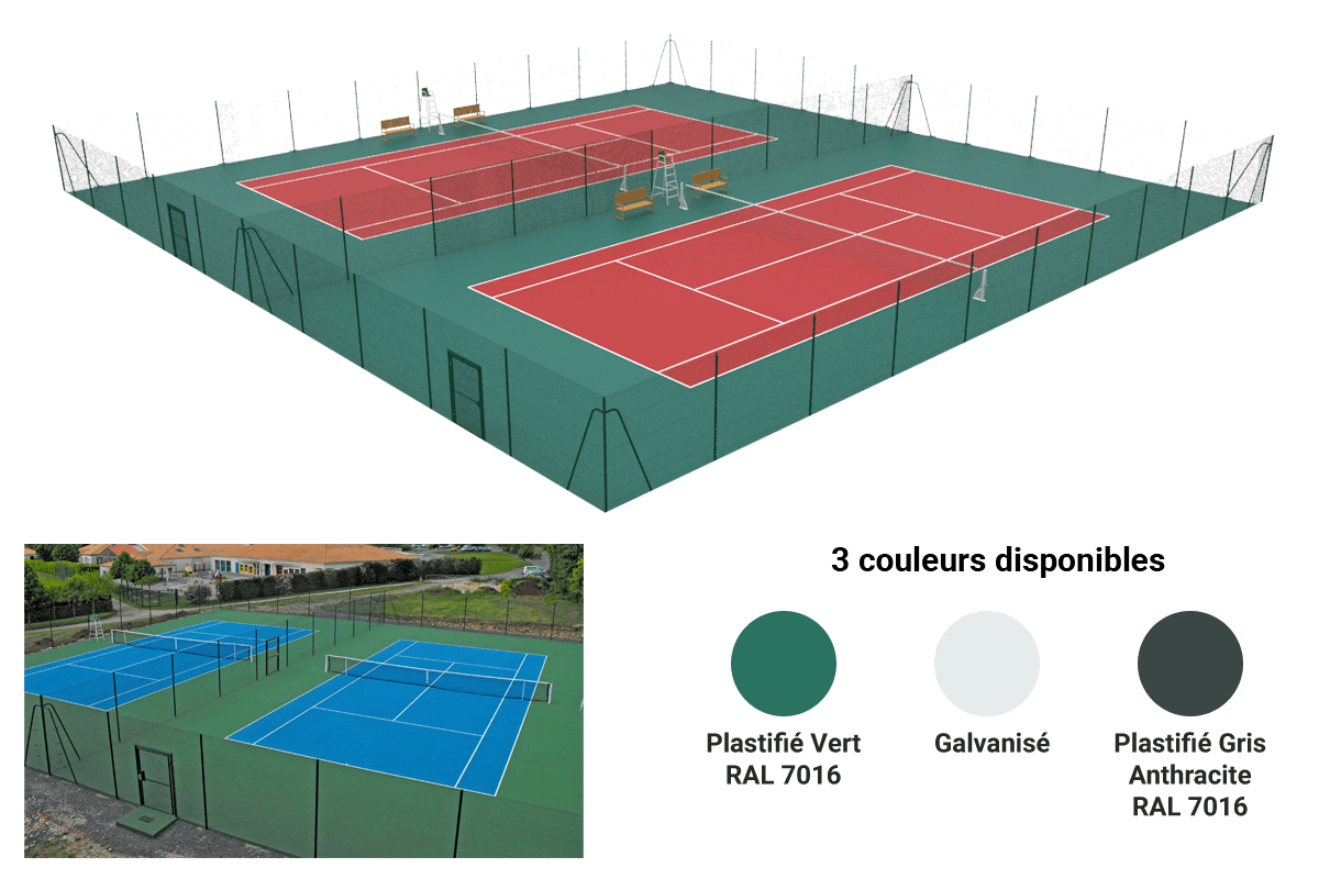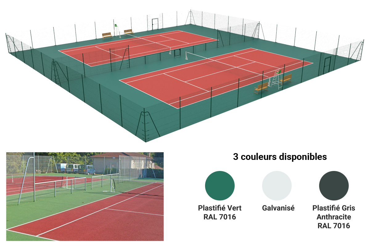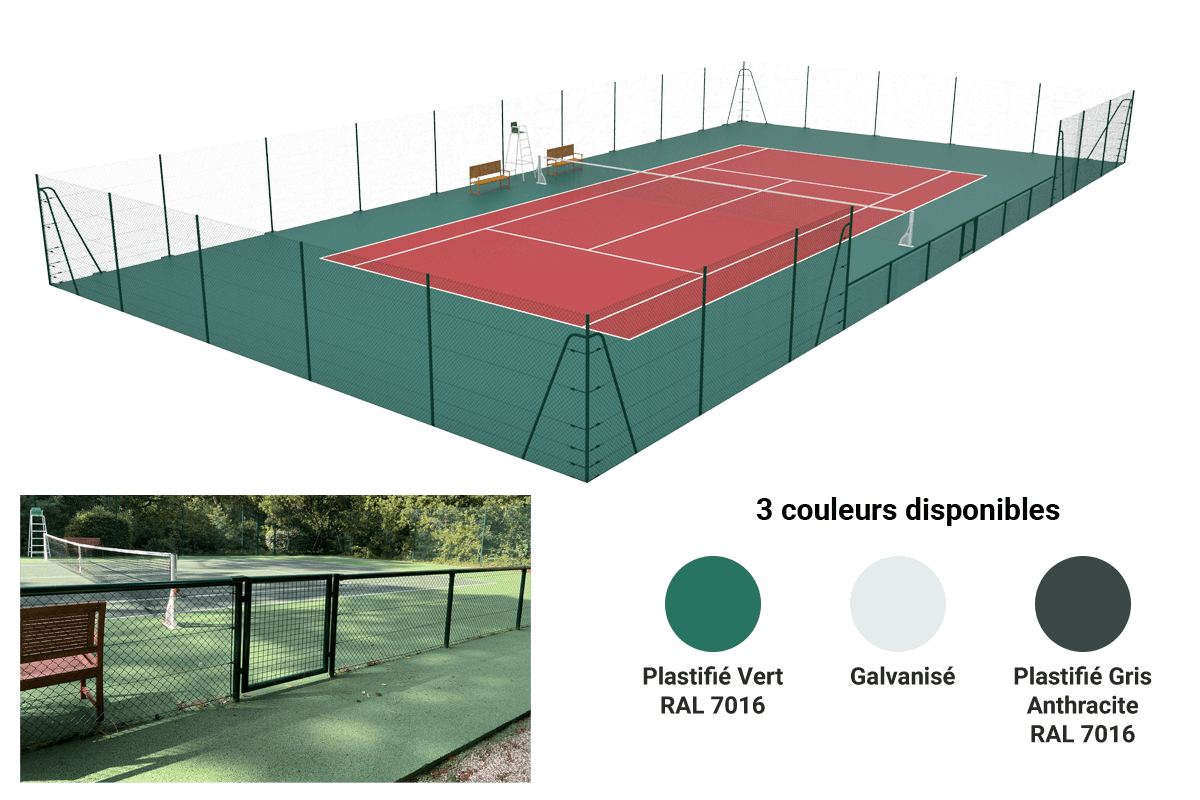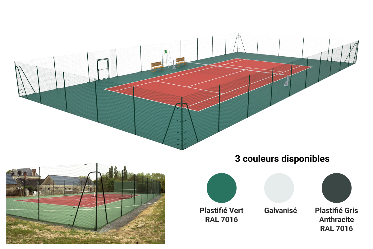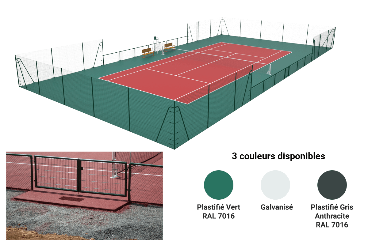 Kit clôture court double «Country Club». 3m Hors sol. Livré avec poteaux, grillage simple torsion et accessoires de fixation.