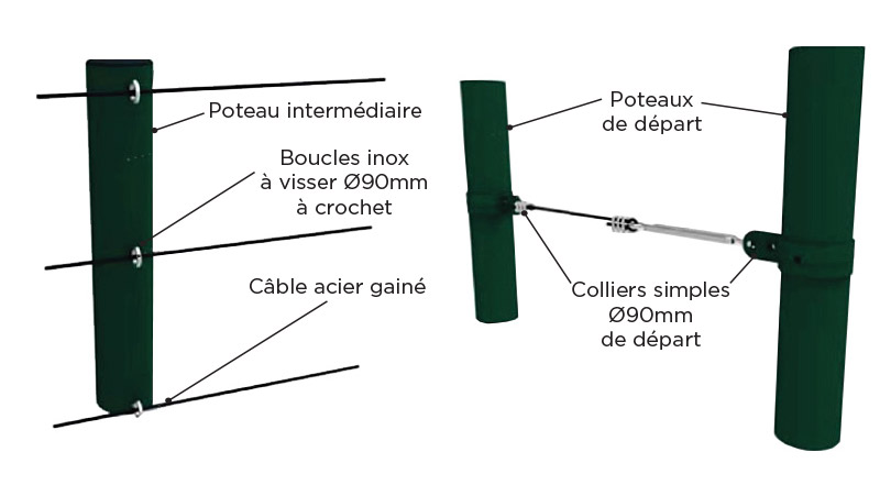 Le grillage simple torsion sur 2m en partie basse est fixé grâce à des “raidisseurs” qui permette la mise en tension du fil passant au travers de passe-fils vissées sur les poteaux tous les 50cm sur la hauteur. Le grillage est agrafé sur les fils de tension